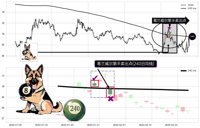 形态多维评估: ⚀ 2020-02-04-日显现 葛兰威尔均线 240日均线 第⑧卖出点 下降趋势的中继信号,后市看跌,卖出信号