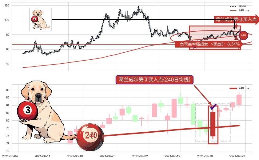 形态多维评估: ⚀ 2021-07-19-日显现 葛兰威尔均线 240日均线 第③买入点 上升趋势的中继信号,后市看涨,买进信号