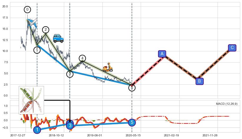 ➣ 第一, 三, 五浪下跌动能逐渐【衰弱变小】,趋势呈现不稳迹象