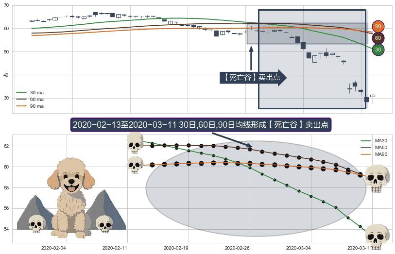 ⚂ 【死亡谷】卖出点 由MA30均线下穿MA60均线和MA90均线,MA60均线下穿MA90均线形成
