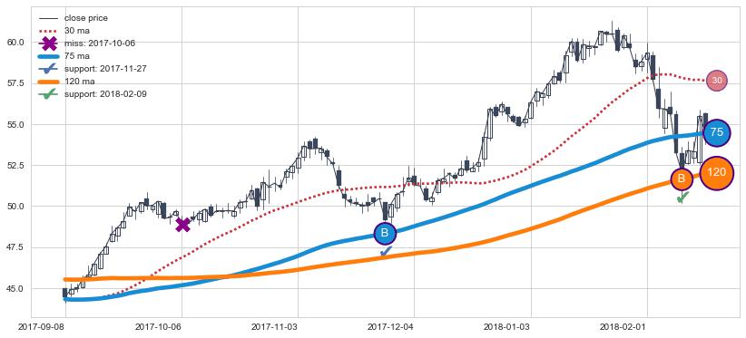 上涨趋势2017-09-08-2018-02-15,均线120, 75确认关键支撑2处