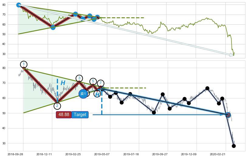 ➢ 最小中继整理跌幅→𝐇: 17.23 (低点逐步抬高斜边第一支撑点②与阻力边垂直距离)