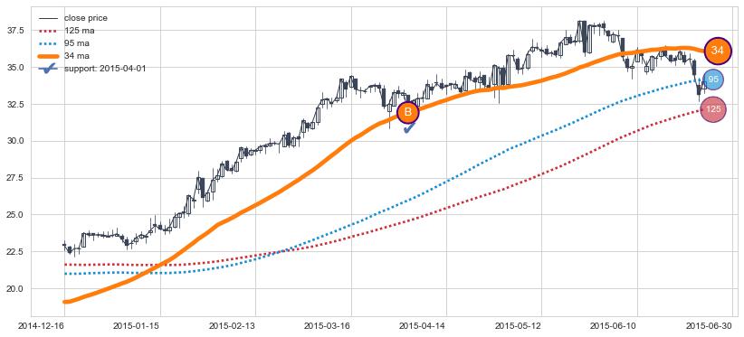 上涨趋势2014-12-16-2015-06-30,均线34确认关键支撑1处