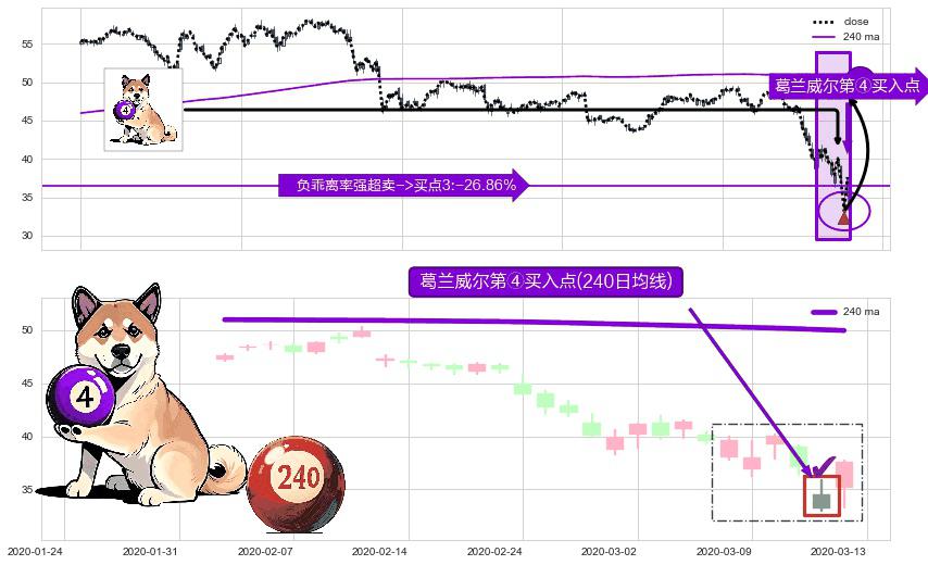 形态多维评估: ⚀ 2020-03-12-日显现 葛兰威尔均线 240日均线 第④买入点 下降趋势均值回复的短线反弹信号,后市看涨,买进信号