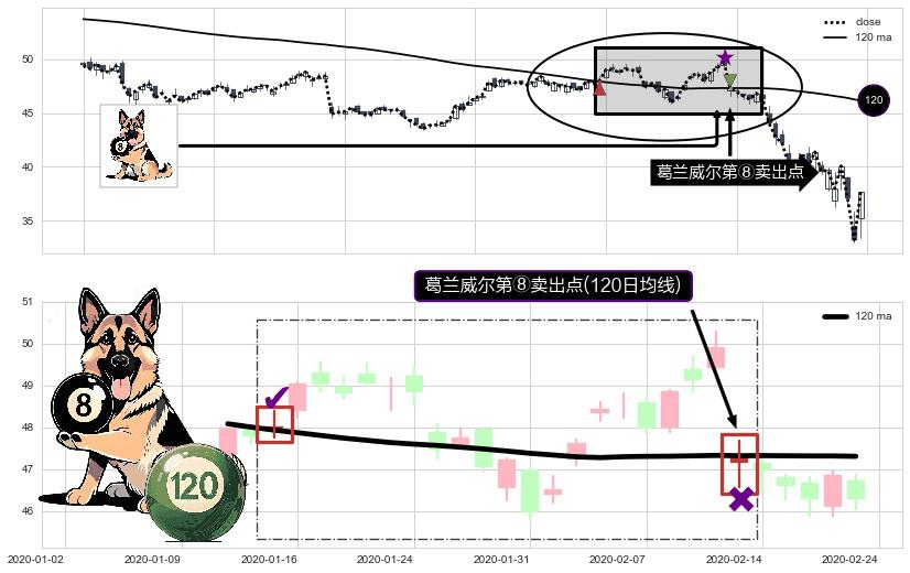 形态多维评估: ⚀ 2020-02-13-日显现 葛兰威尔均线 120日均线 第⑧卖出点 下降趋势的中继信号,后市看跌,卖出信号