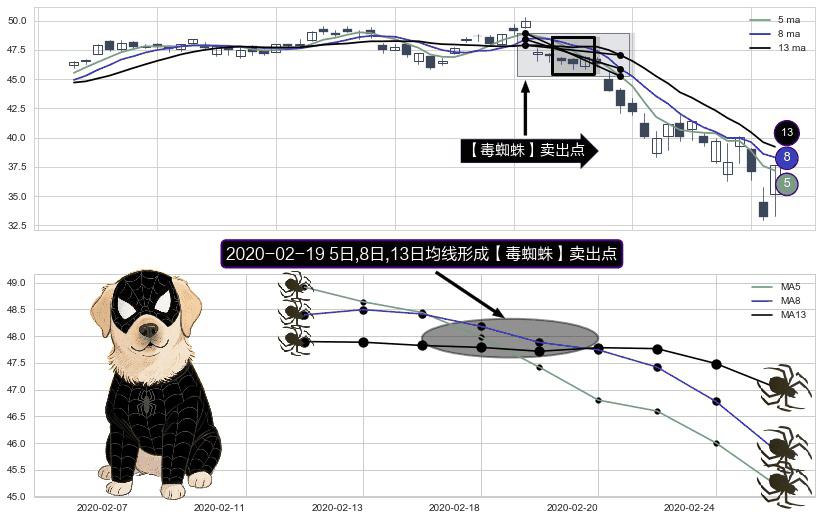 形态多维评估: ⚀ 2020-02-19日显现 5日-8日-13日均线 【毒蜘蛛】卖出点 看空信号,后市看跌,卖出