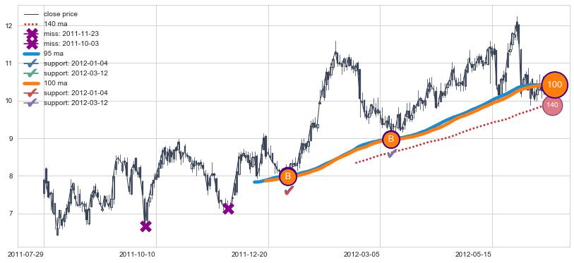 ➢ 最优均线组合共正确确认支撑阻力信号5处,正确确认率 55.56%