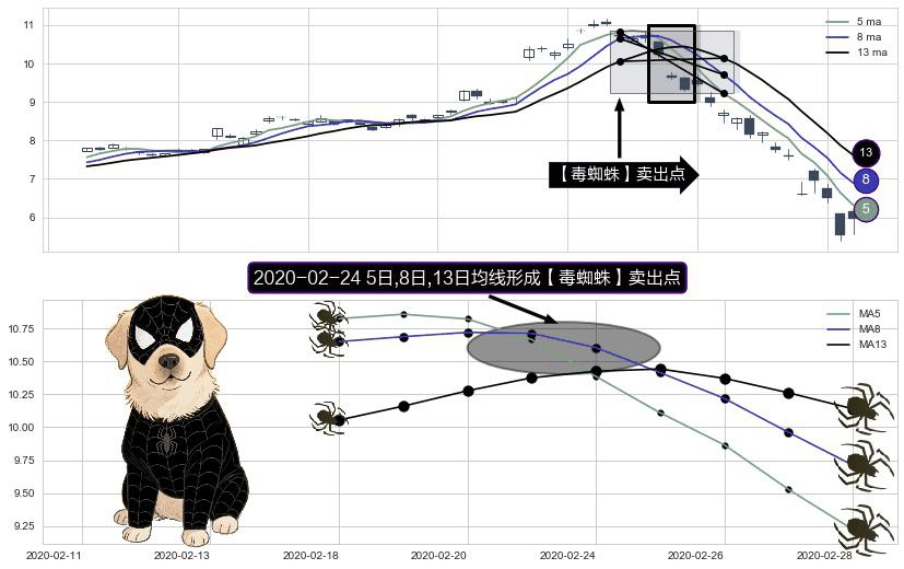 形态多维评估: ⚀ 2020-02-24日显现 5日-8日-13日均线 【毒蜘蛛】卖出点 看空信号,后市看跌,卖出