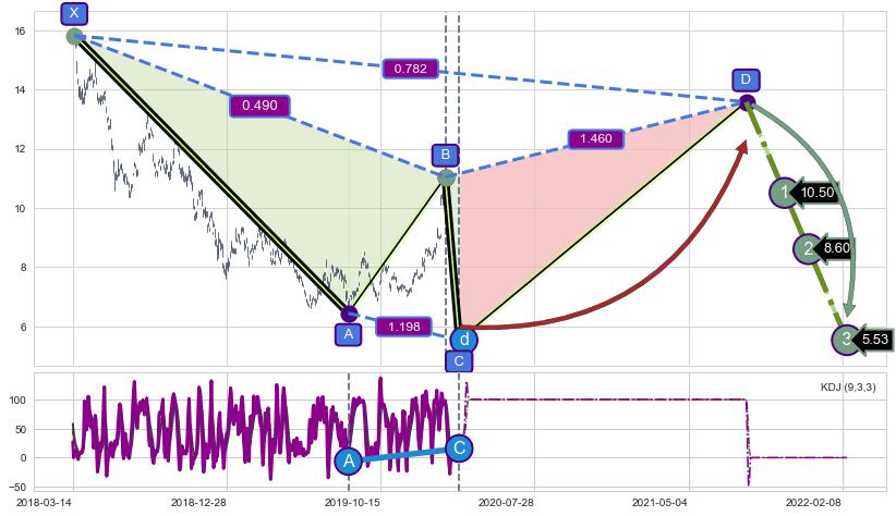 ➣ D点拟合预测价格13.58,距离最后交易收盘价格5.97相差 +127.42%