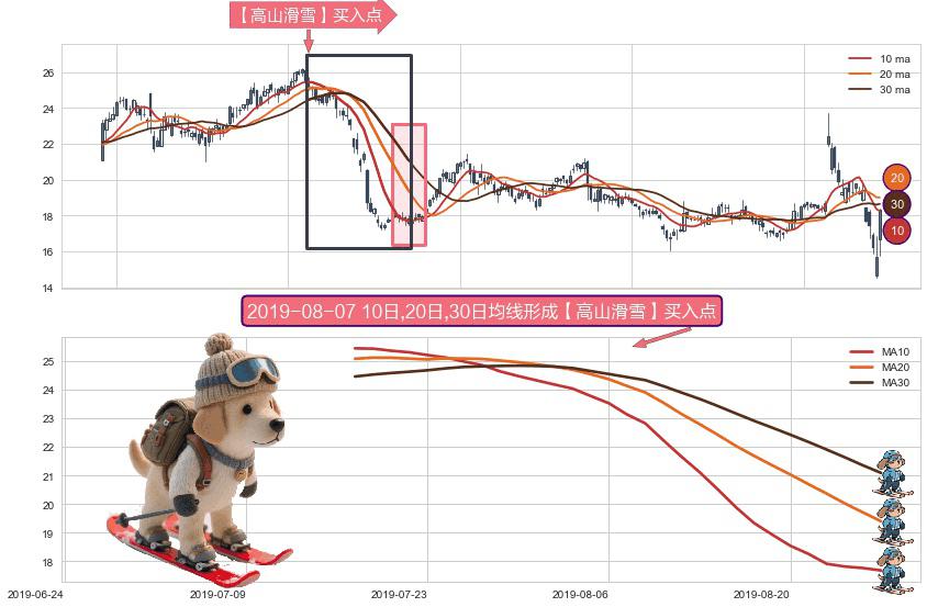 ⚀ 2019-07-17日-2019-08-27日显现 10日-20日-30日均线 【高山滑雪】买入点 看多信号,后市看涨,买入