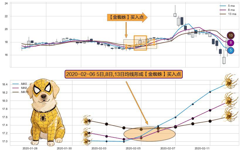 ⚀ 2020-02-06日显现 5日-8日-13日均线 【金蜘蛛】买入点 看多信号,后市看涨,买入
