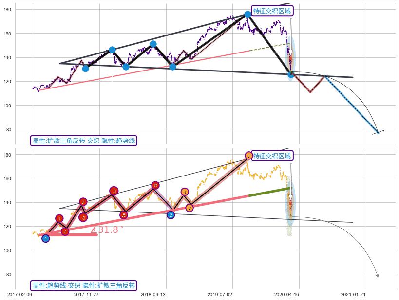 ➣ 【支撑】低点支撑位【③⑤⑦】一底低于一底,构成扩散三角的下斜边
