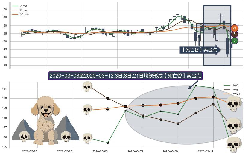 ⚀ 2020-03-04-日至2020-03-12-日显现 3日-8日-21日均线 【死亡谷】卖出点 看空信号,后市看跌,卖出