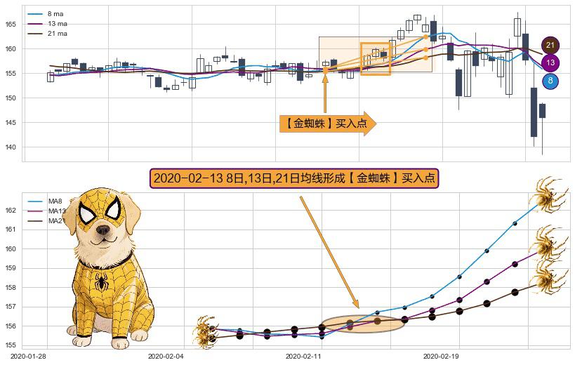 ⚀ 2020-02-13日显现 8日-13日-21日均线 【金蜘蛛】买入点 看多信号,后市看涨,买入