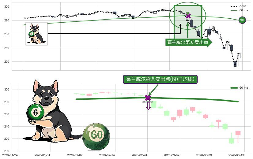 形态多维评估: ⚀ 2020-02-24-日显现 葛兰威尔均线 60日均线 第⑥卖出点 走势反转见顶信号,后市看跌,卖出信号