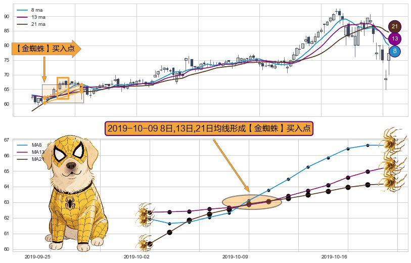 ⚀ 2019-10-09日显现 8日-13日-21日均线 【金蜘蛛】买入点 看多信号,后市看涨,买入