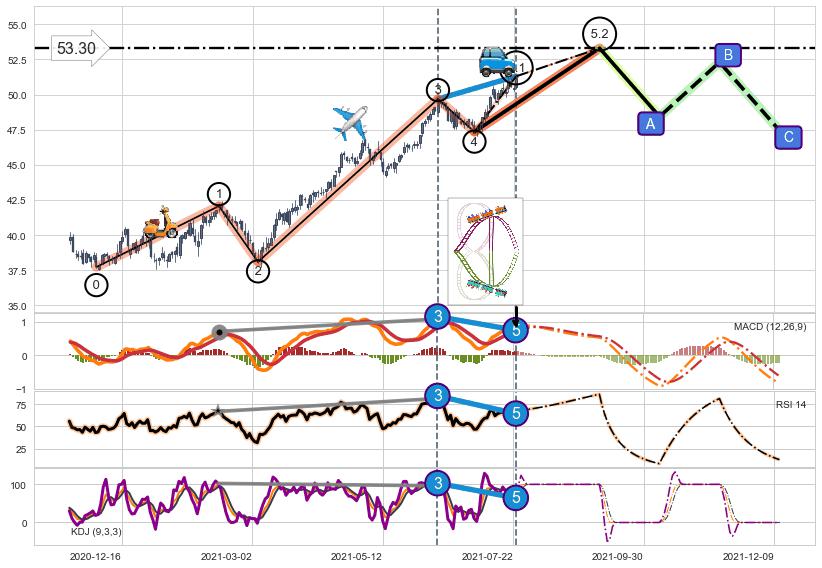 ➣ 5.1: 预测当前第5浪位置(2021-07-23, 51.30),仍然有上升空间