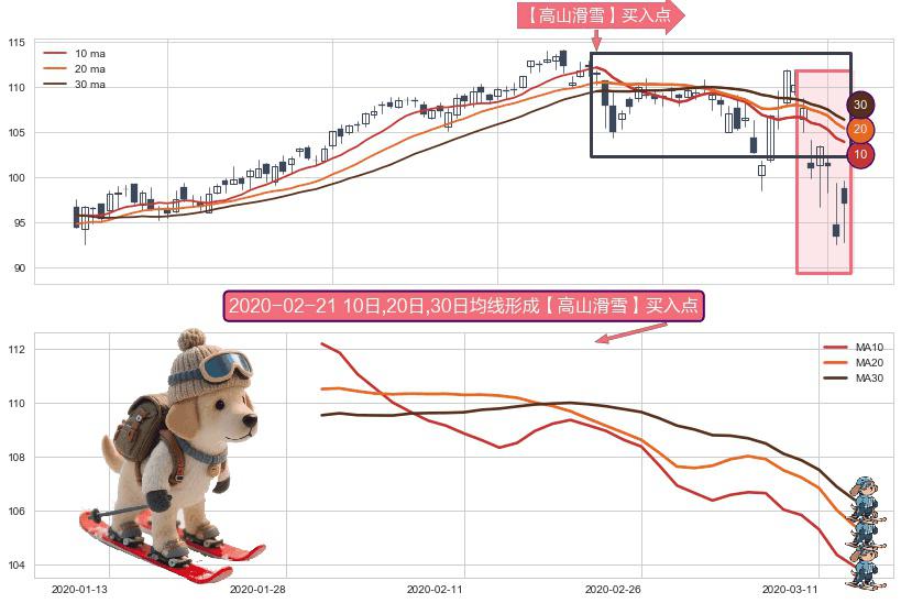 ⚀ 2020-01-30日-2020-03-13日显现 10日-20日-30日均线 【高山滑雪】买入点 看多信号,后市看涨,买入