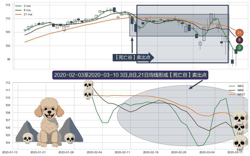 ⚀ 2020-02-04-日至2020-03-10-日显现 3日-8日-21日均线 【死亡谷】卖出点 看空信号,后市看跌,卖出