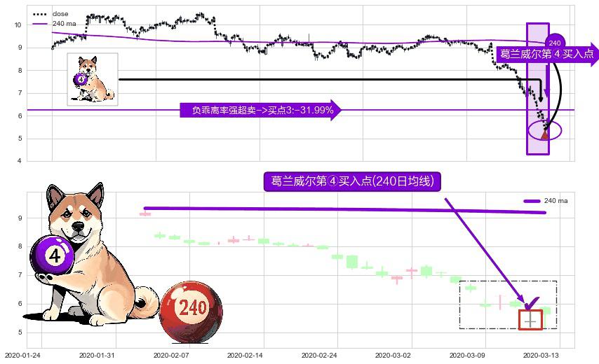 形态多维评估: ⚀ 2020-03-12-日显现 葛兰威尔均线 240日均线 第④买入点 下降趋势均值回复的短线反弹信号,后市看涨,买进信号