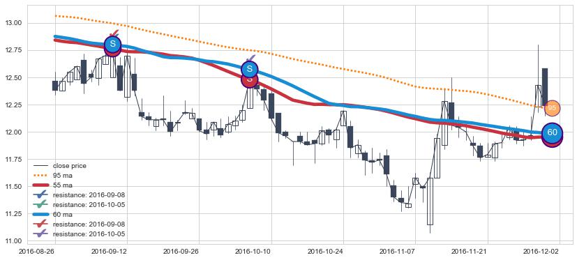 下跌趋势2016-08-26-2016-12-02,均线60, 55确认关键阻力2处