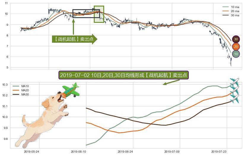形态多维评估: ⚀ 2019-06-10日-2019-07-24日显现 10日-20日-30日均线 【战机起航】卖出点 看空信号,后市看跌,卖出