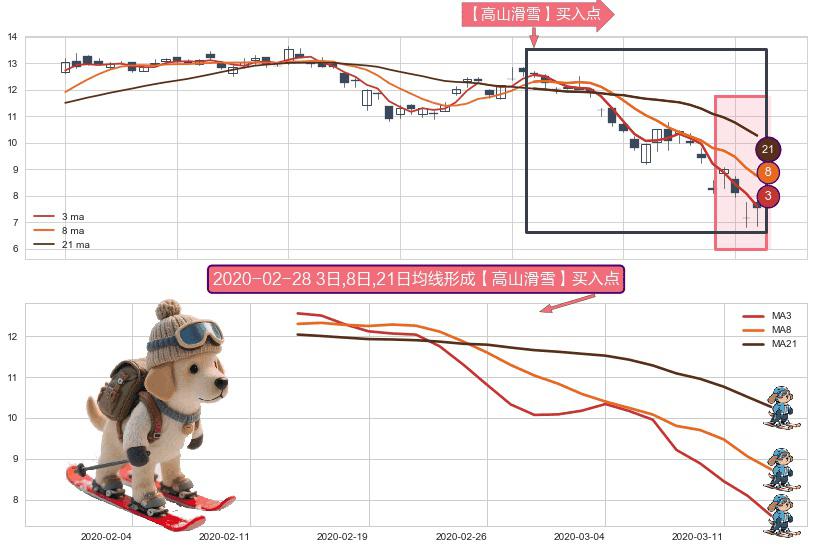 形态多维评估: ⚀ 2020-02-13日-2020-03-13日显现 3日-8日-21日均线 【高山滑雪】买入点 看多信号,后市看涨,买入