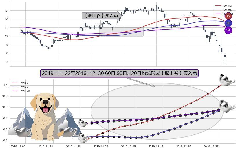 形态多维评估: ⚀ 2019-11-25-日至2019-12-30-日显现 60日-90日-120日均线 【银山谷】买入点 看多信号,后市看涨,买入