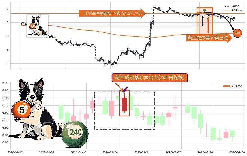 形态多维评估: ⚀ 2020-01-27-日显现 葛兰威尔均线 240日均线 第⑤卖出点 上升趋势均值回复的短线回落信号,后市看跌,卖出信号