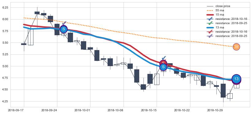 下跌趋势2018-09-17-2018-10-31,均线13, 15确认关键阻力2处