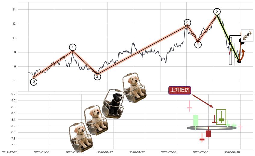 | 4 🅚:仙人指路 ➕ 🌊:波浪理论上涨5浪延续:猜想C点强支撑小回调终止,猜想保持上涨5浪方向拉升(均值回复后大周期继续趋势跟踪) ☞ 看多信号 ⇥ 【🅚线】交织【图形】⇥ 综合量化分数: 55 | > |