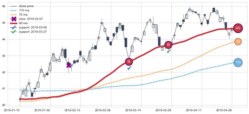 上涨趋势2019-01-15-2019-04-29,均线40确认关键支撑2处