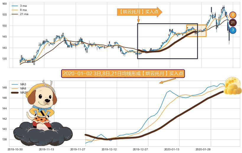 ⚀ 2019-11-27日-2020-02-05日显现 3日-8日-21日均线 【烘云托月】买入点 看多信号,后市看涨,买入