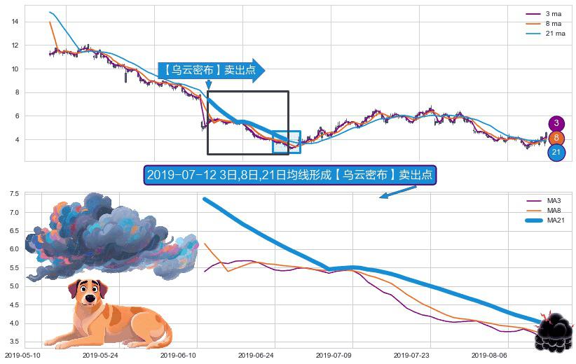 形态多维评估: ⚀ 2019-06-11日-2019-08-13日显现 3日-8日-21日均线 【乌云密布】卖出点 看空信号,后市看跌,卖出