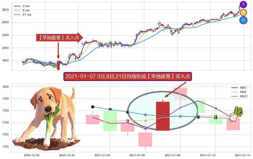 ⚀ 2021-01-07日显现 3日-8日-21日均线 【旱地拔葱】买入点 看多信号,后市看涨,买入