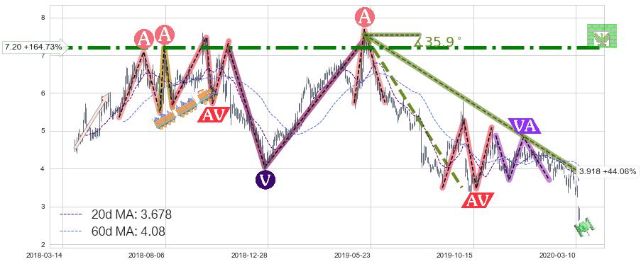 ♘ 阻力价格位7.20,可信任强度99.00%,距离最后交易2020-03-13形成的收盘价格2.720相差 +164.73%