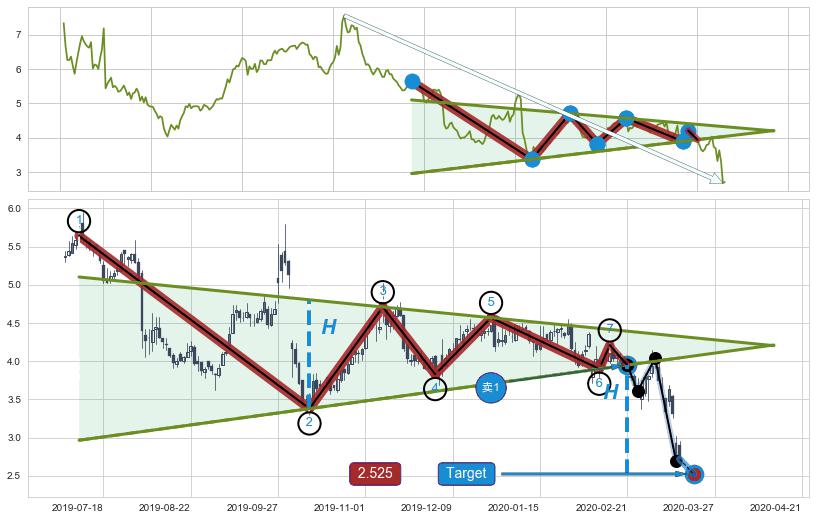➣ 【多空双方观望→争持→促使价格波动日益狭窄→空方打破攻守平衡点】对称三角形中继整理, 已在2020-02-21突破【支撑】颈线 3.950 →演变成下降通道
