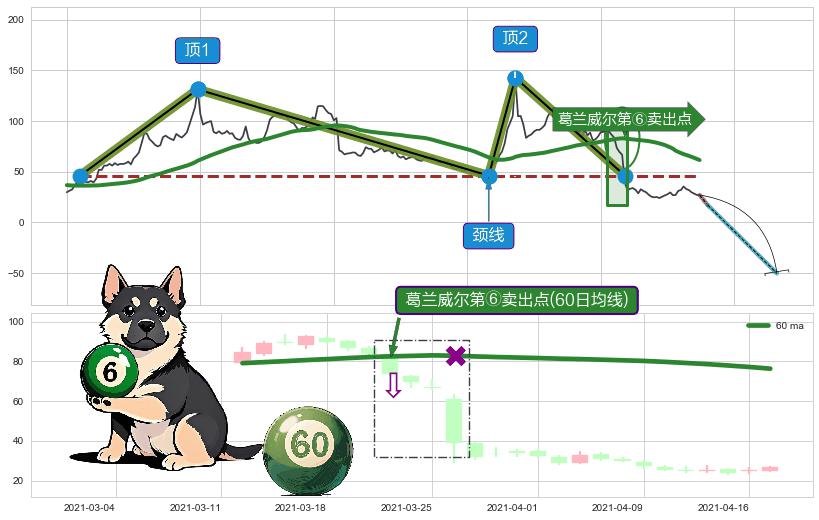 ➢ 【卖1】: 激进型 卖点→(2021-03-26: 46.21 )形成突破双重顶【反转】形态