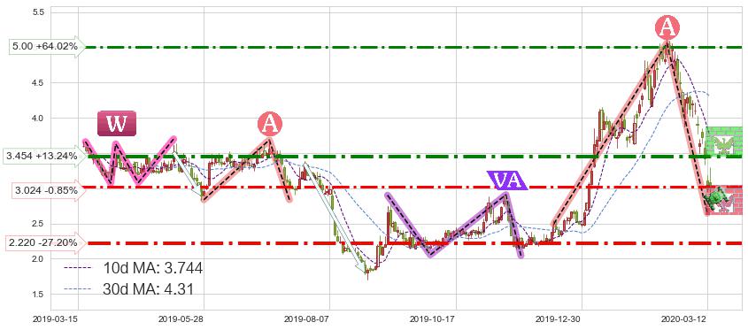 ♘ 支撑价格位2.220,可信任强度71.90%,距离最后交易2020-03-13形成的收盘价格3.050相差 -27.20%