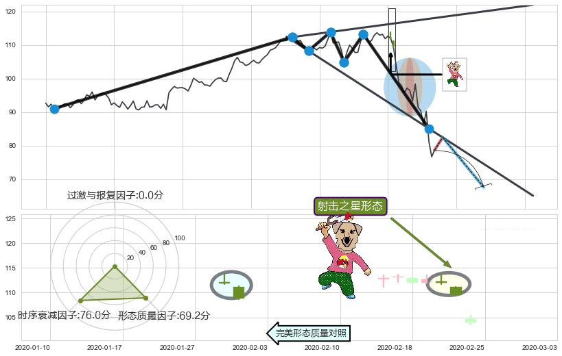 | 2 🅚:倾盆大雨 ➕ 📐:扩散三角反转下行突破支撑位破位, 猜想持续下沉下跌,被突破的支撑位已变为阻力位 ☞ 看空信号 ⇥ 【🅚线】交织【图形】⇥ 综合量化分数: 46 | > |