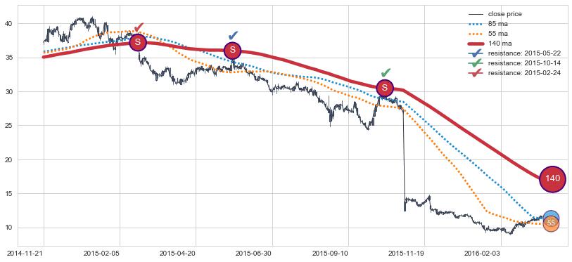 下跌趋势2014-11-21-2016-03-14,均线140确认关键阻力3处