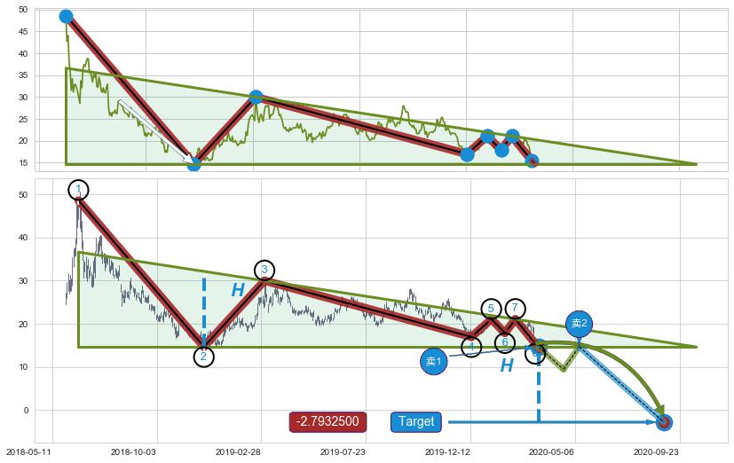 ➣ 最小中继整理跌幅→𝐇: 17.45 (下侧直角边第一支撑点②与斜边垂直距离)