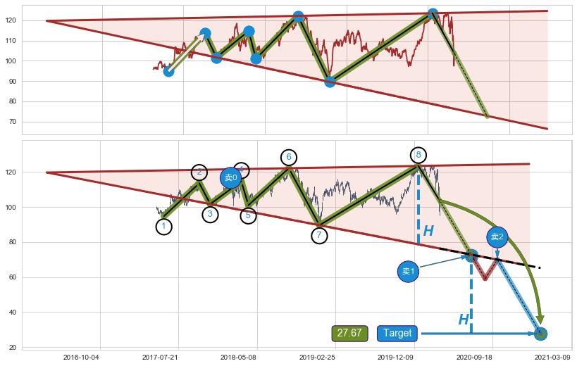 ➢ 最小反转跌幅→𝐇: 44.83 (逐步抬高阻力斜边最后的阻力点⑧与支撑边垂直距离)