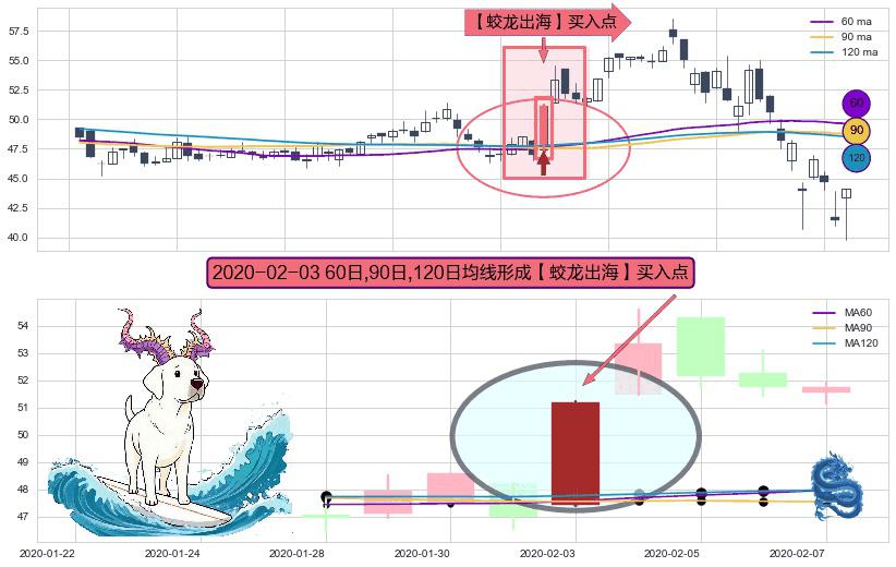⚃ 2020-02-03日开盘价格在三条均线下收大阳线,收盘全突破均线,收盘股价上涨8.87%