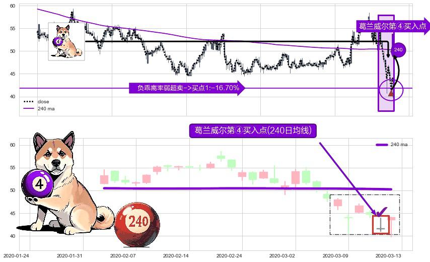 形态多维评估: ⚀ 2020-03-12-日显现 葛兰威尔均线 240日均线 第④买入点 下降趋势均值回复的短线反弹信号,后市看涨,买进信号