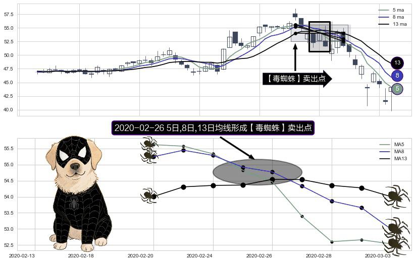 形态多维评估: ⚀ 2020-02-26日显现 5日-8日-13日均线 【毒蜘蛛】卖出点 看空信号,后市看跌,卖出