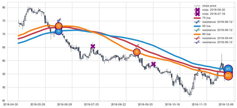 下跌趋势2018-04-30-2018-12-06,均线75, 60, 95确认关键阻力2处