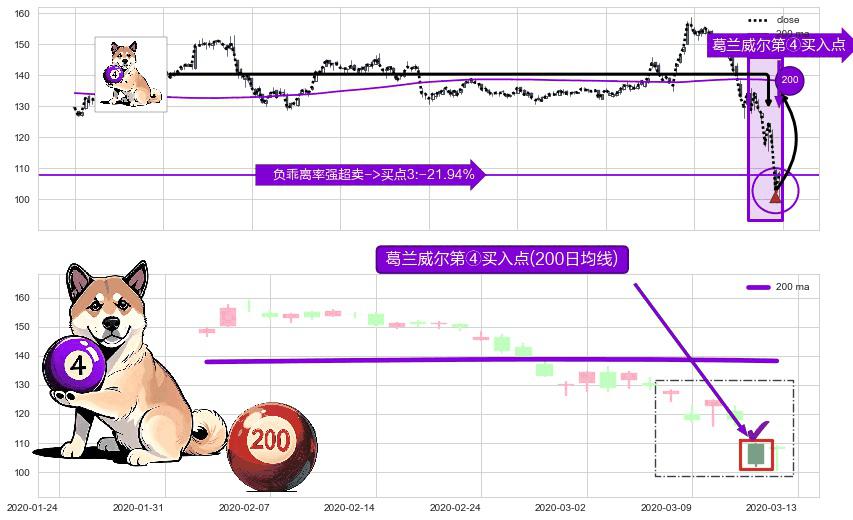 形态多维评估: ⚀ 2020-03-12-日显现 葛兰威尔均线 200日均线 第④买入点 下降趋势均值回复的短线反弹信号,后市看涨,买进信号