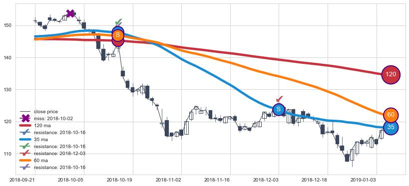 下跌趋势2018-09-21-2019-01-07,均线120, 35, 60确认关键阻力2处