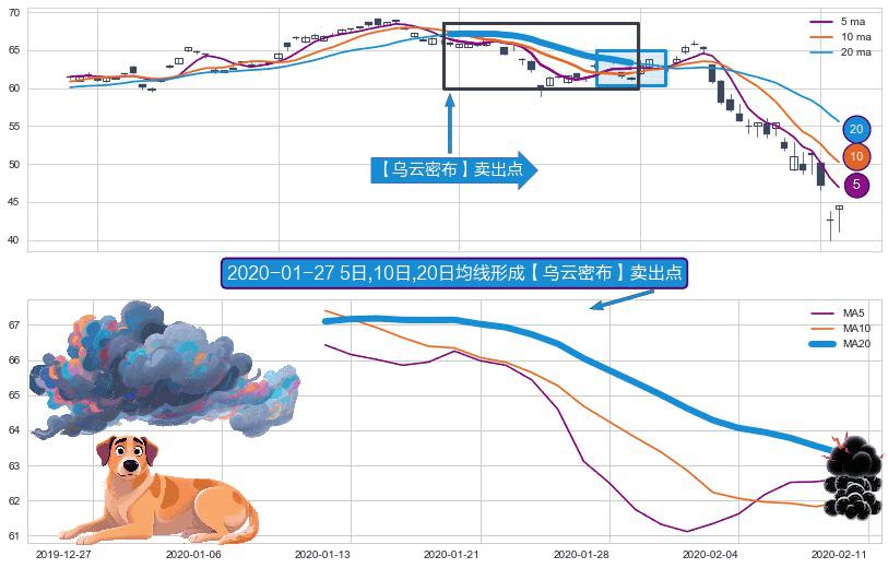 形态多维评估: ⚀ 2020-01-10日-2020-02-10日显现 5日-10日-20日均线 【乌云密布】卖出点 看空信号,后市看跌,卖出